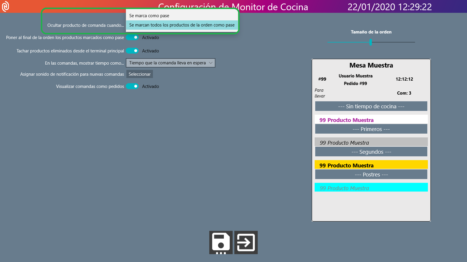 El monitor de cocina permite ocultar el producto de la comanda: o cuándo se marca este como pase, o cuando se marcan todos los productos del pedido como pase, es configurable.