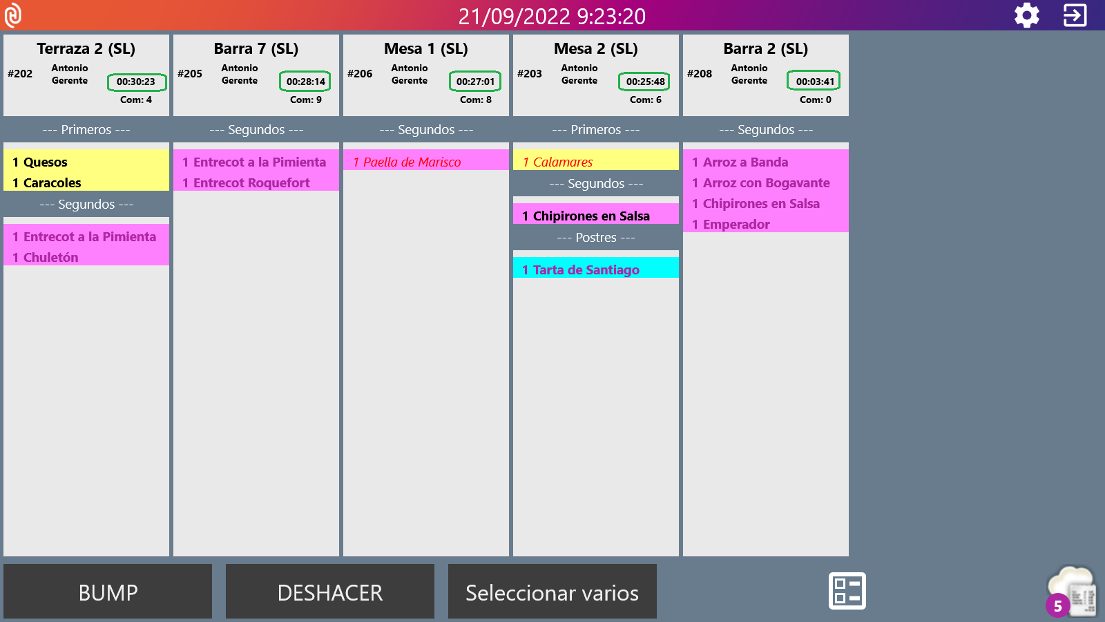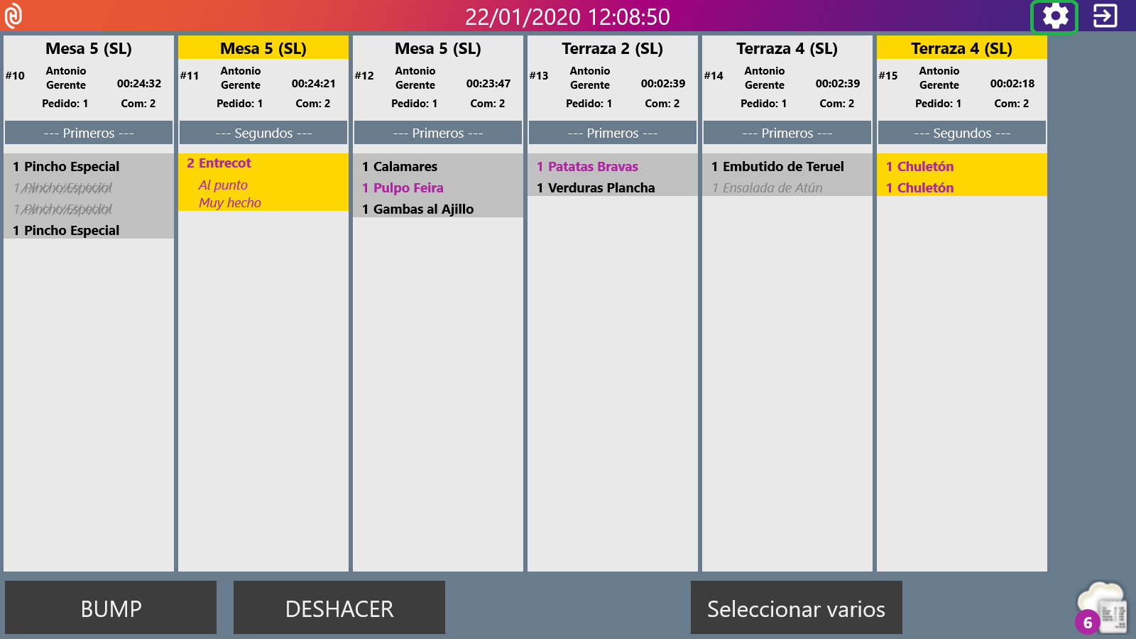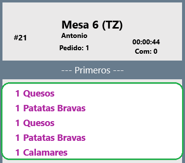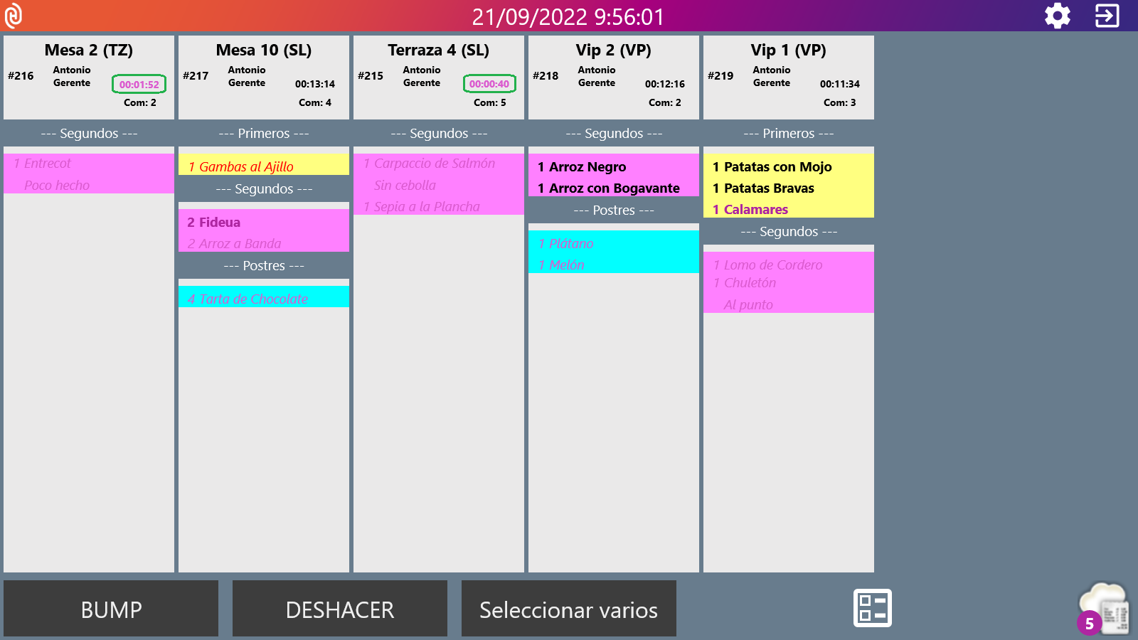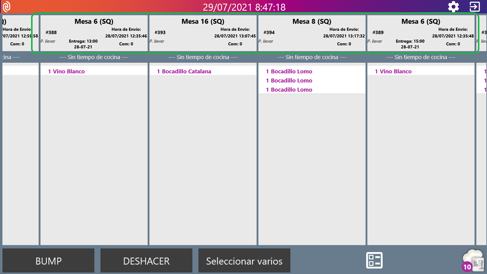 En cambio, para la mesa Mesa 10 (SL) 00:13:14, Vip 2 (VP) 00:12:16 y Vip 1 (VP) 00:11:34, el tiempo de espera desde que llegó la comanda, se muestra en negrita e incremental.