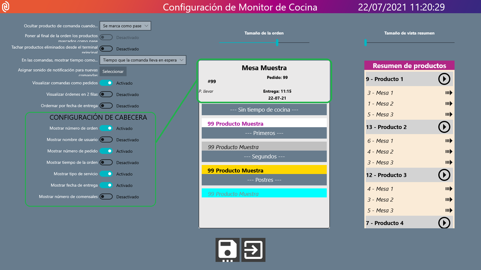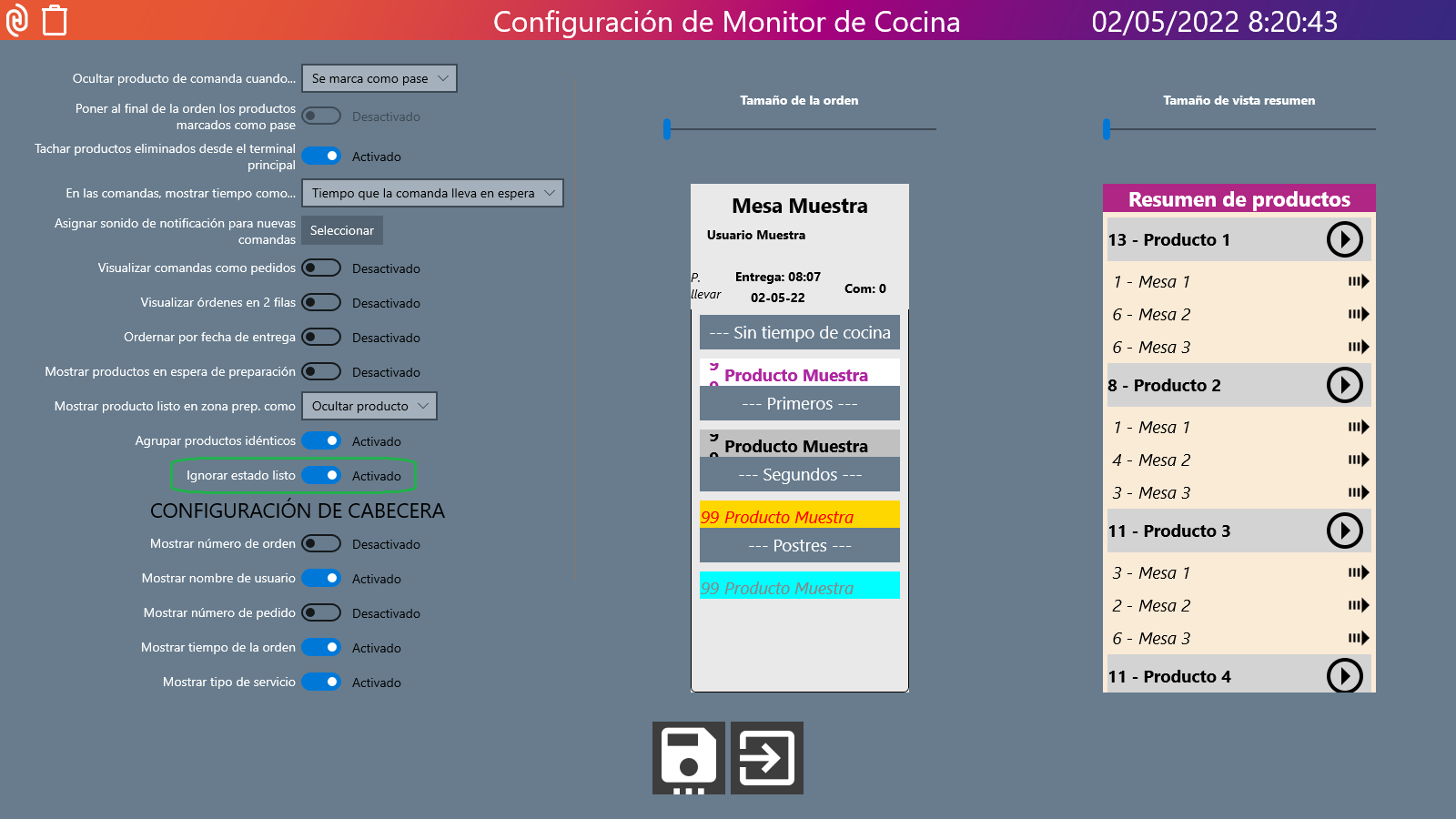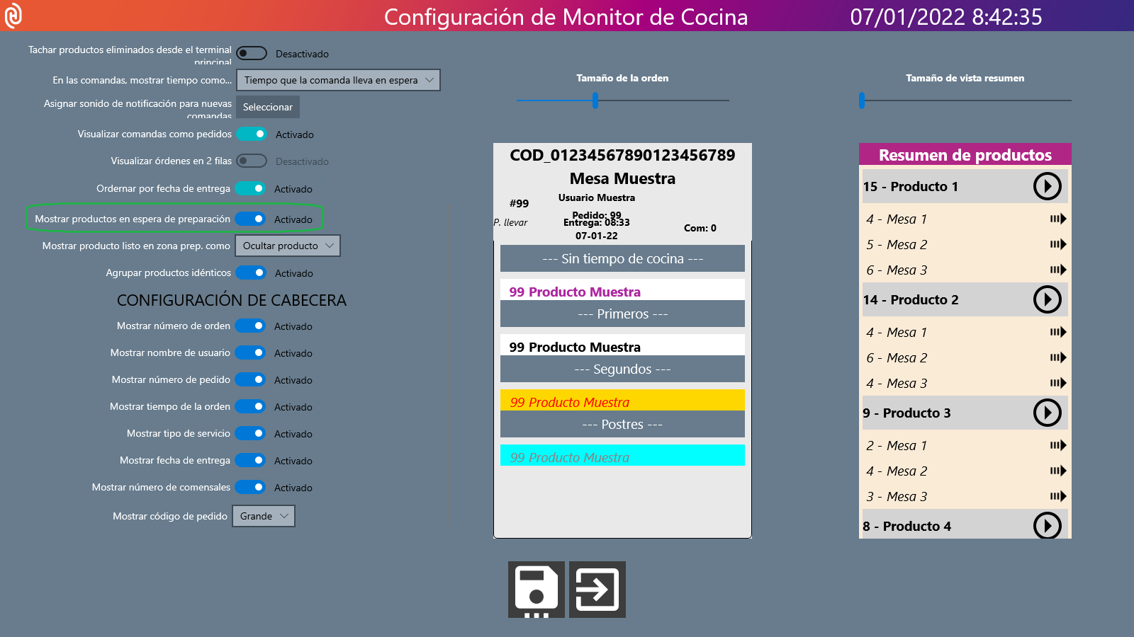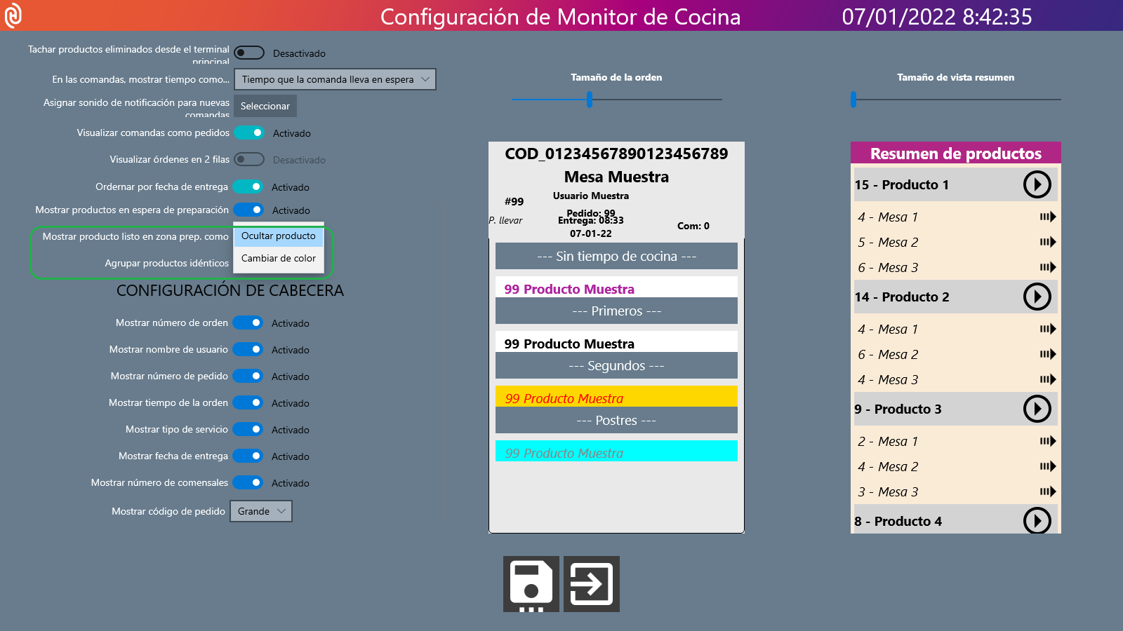 Elegir cómo visualizar el resumen de productos en el monitor de cocina