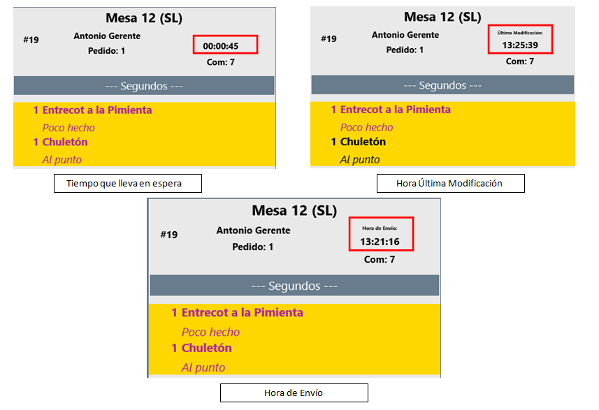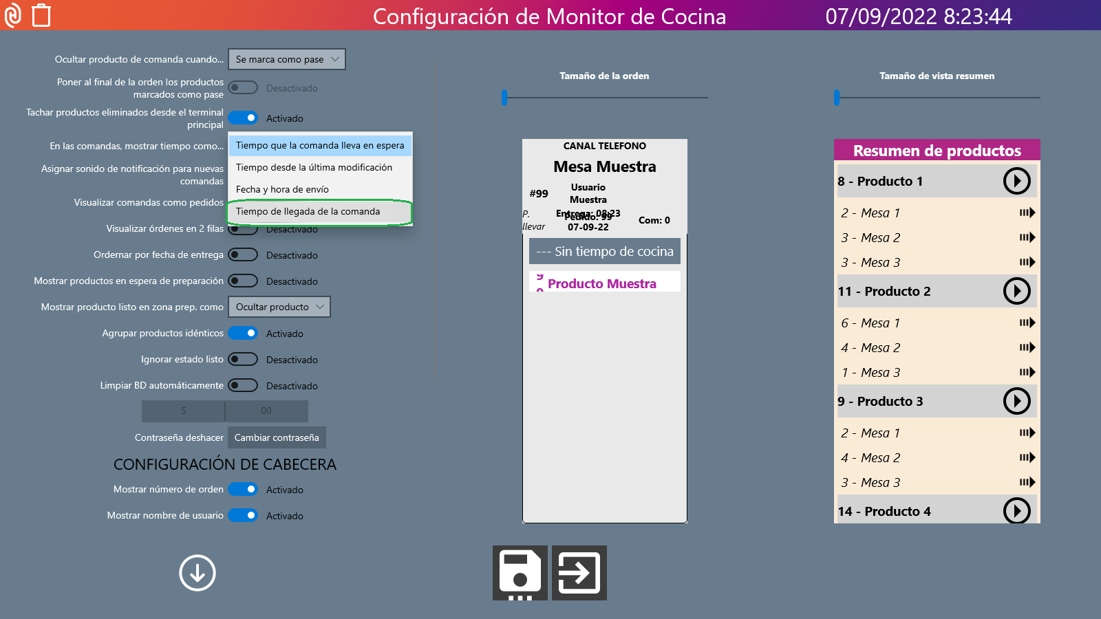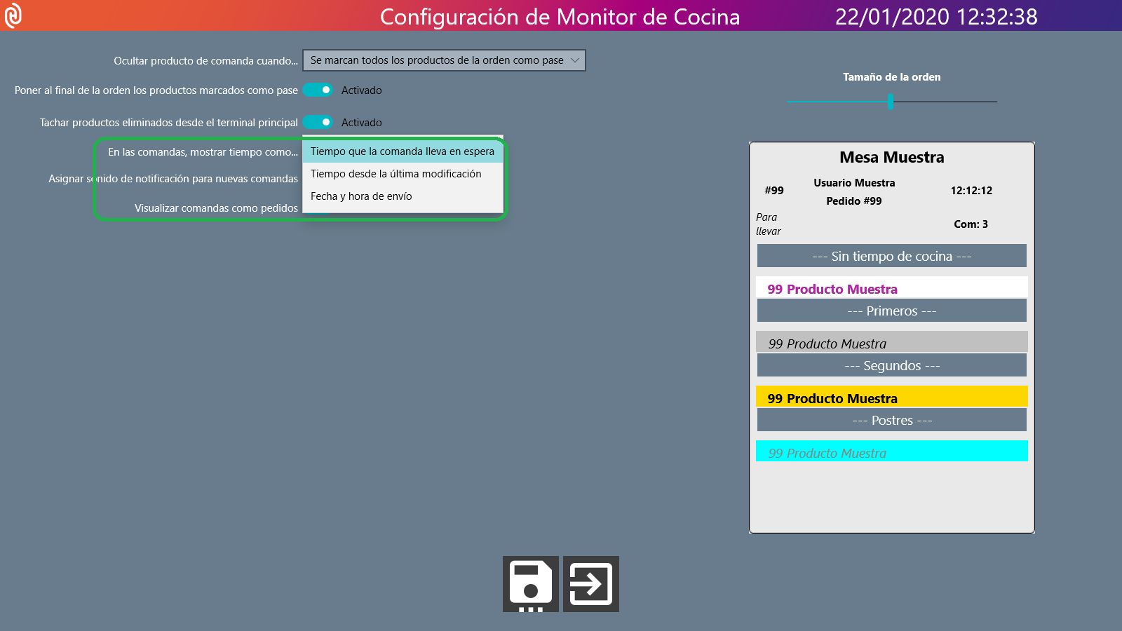 El monitor de cocina permite mostrar o el tiempo que la comanda lleva en espera, o el tiempo desde la última modificación o la fecha y hora de envío. Selecciona una a tu gusto.