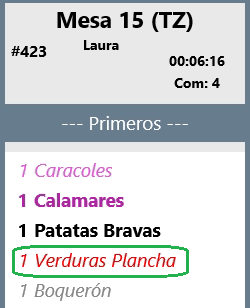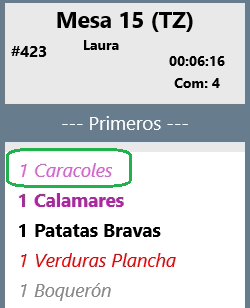 Los productos en espera de preparación se muestran en pantalla de forma visible en cursiva y un tono violáceo apagado, como la ración de 1 Caracoles del ejemplo.