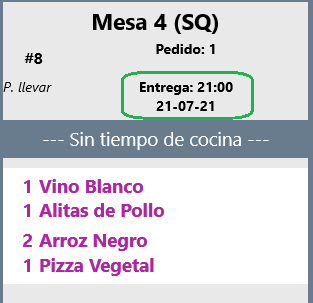 La fecha y hora de entrega se muestra en la cabecera de la comanda: