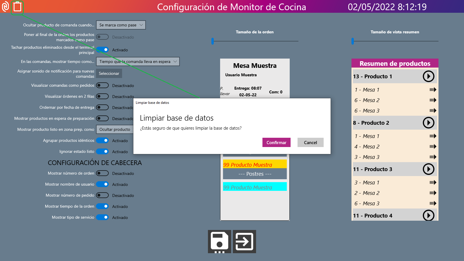 Si deseas limpiar la base de datos de comandas del monitor de cocina, pulsa en el icono de la papelera y acepta el mensaje de confirmación. Por favor, ten en cuenta que esta limpieza afecta a las comandas mostradas en pantalla y no a la configuración del KDS.