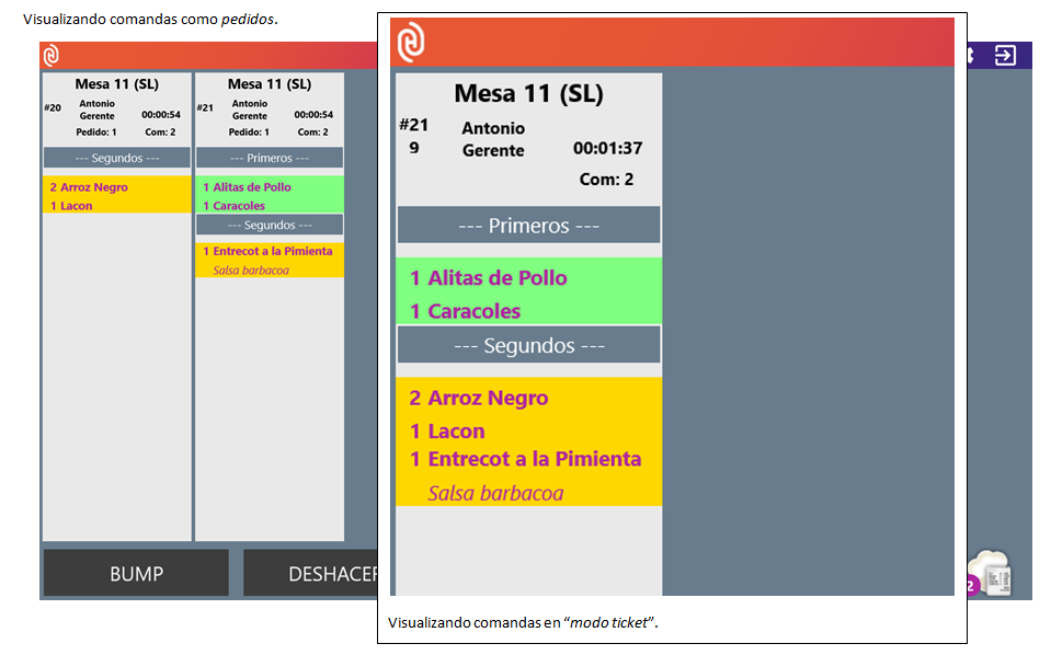 El KDS permite visualizar las comandas cómo ‘pedidos’ (cada envío genera una nueva columna) o en ‘modo ticket’ (se muestran todas las comandas de la mesa en la misma columna).