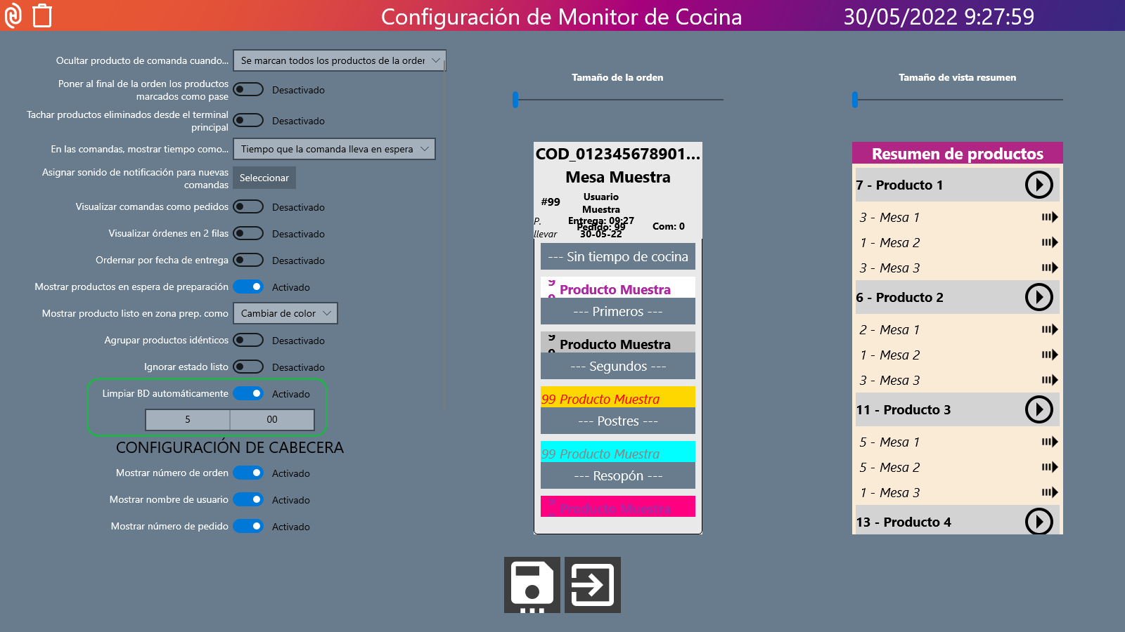 Si deseas limpiar la base de datos de comandas del monitor de cocina de forma automática, utiliza la opción de configuración Limpiar BD automáticamente y configura la hora del proceso. Por favor, ten en cuenta que esta limpieza afecta a las comandas mostradas en pantalla y no a la configuración del KDS.