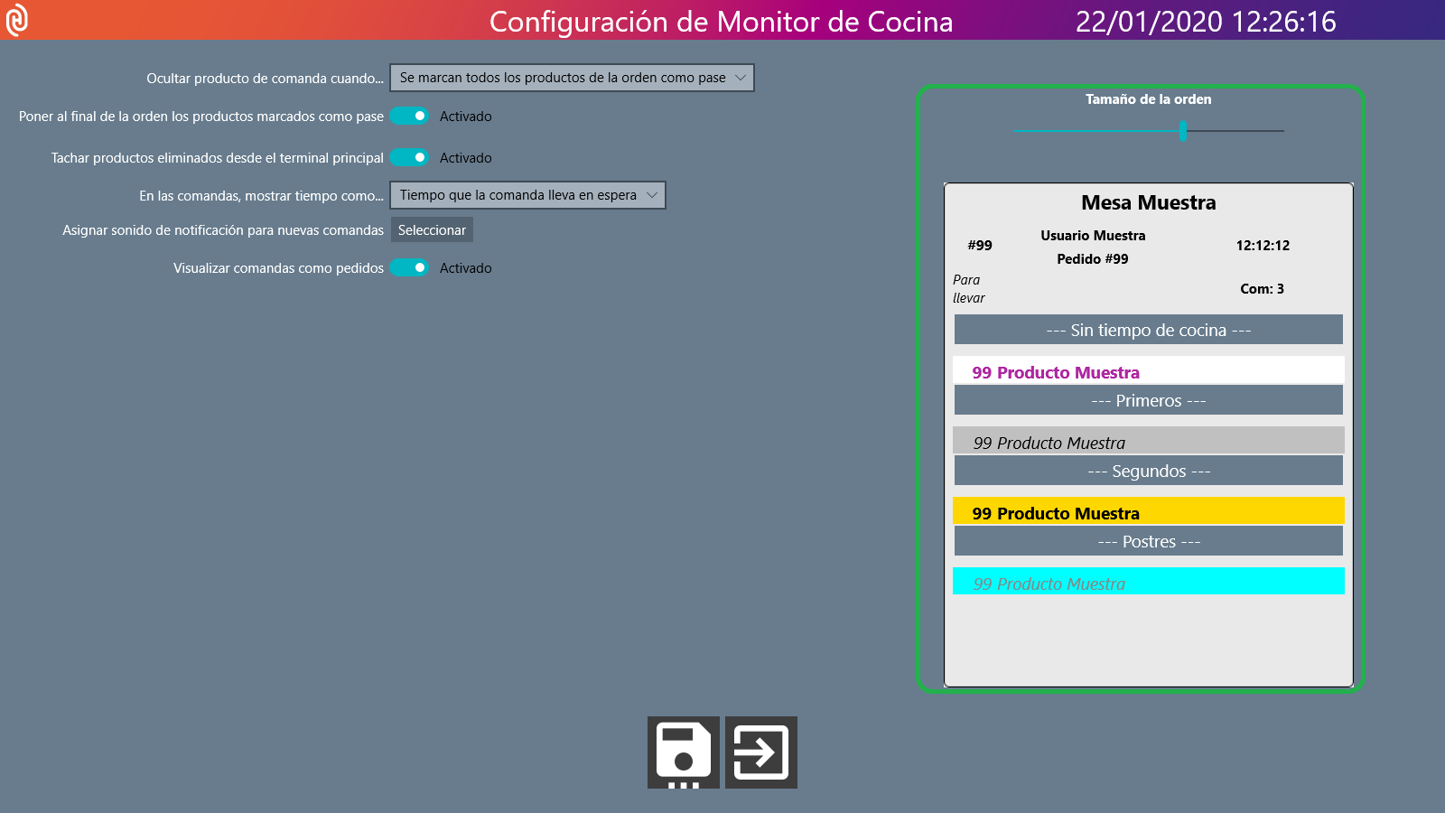 Las órdenes de pedido están a la vista de todo el personal de cocina con una anchura personalizable, en la misma columna por mesa y salón, o columnas diferentes para nuevas comandas de la misma mesa, puedes elegir el sonido que reproducirá el monitor para los avisos, y más cosas que te explicamos a continuación.