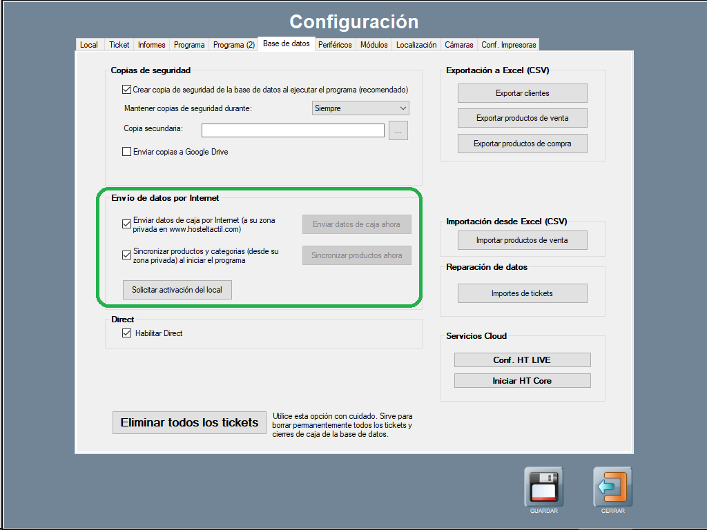 Conectar Hosteltáctil® Pro con Cloud es muy sencillo, tan solo has de rellenar los datos del local, y solicitar la activación usando el botón disponible en Panel de gestión / Configuración / Configurar opciones, pestaña Bases de datos, sección Envío de datos por Internet.