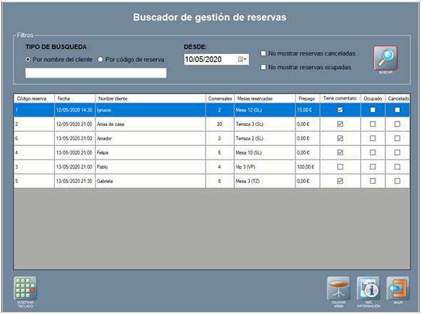 Se abre la ventana de Buscador de Gestión de Reservas, con la relación de las reservas generadas desde el motor web CoverManager o Restoo.