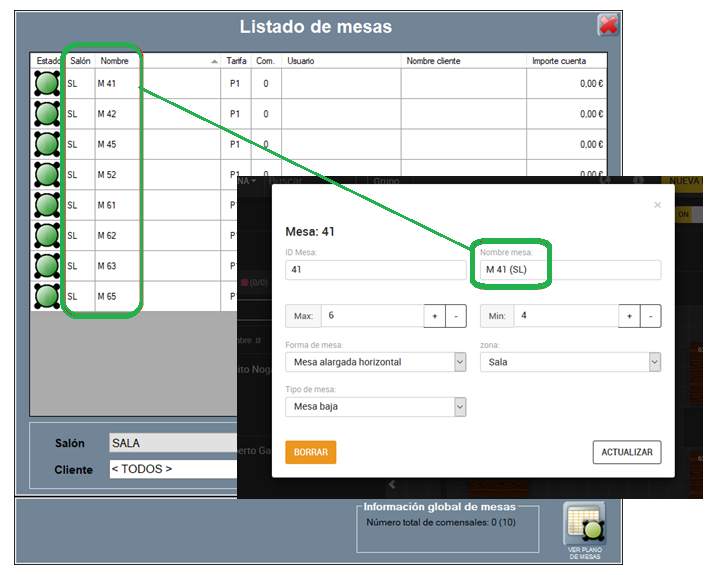 • En modo normal: el nombre de la mesa será Nombre mesa (Abreviatura salón), y si no existe abreviatura de salón será Nombre mesa (Nombre del salón).