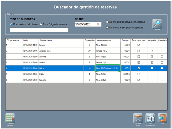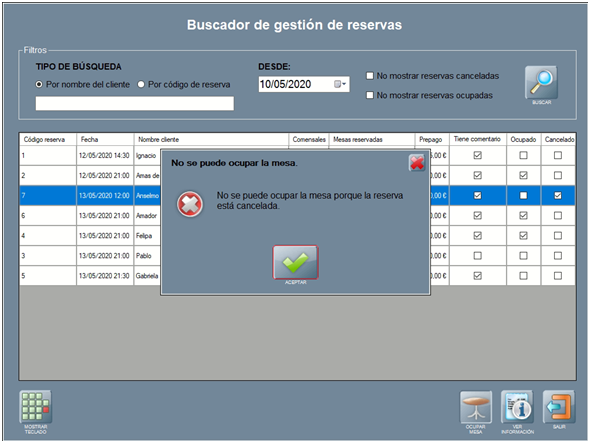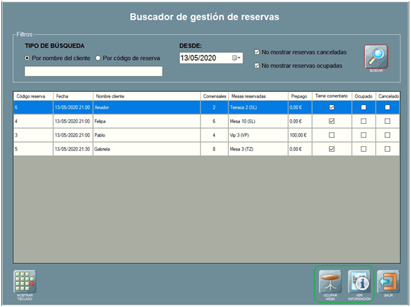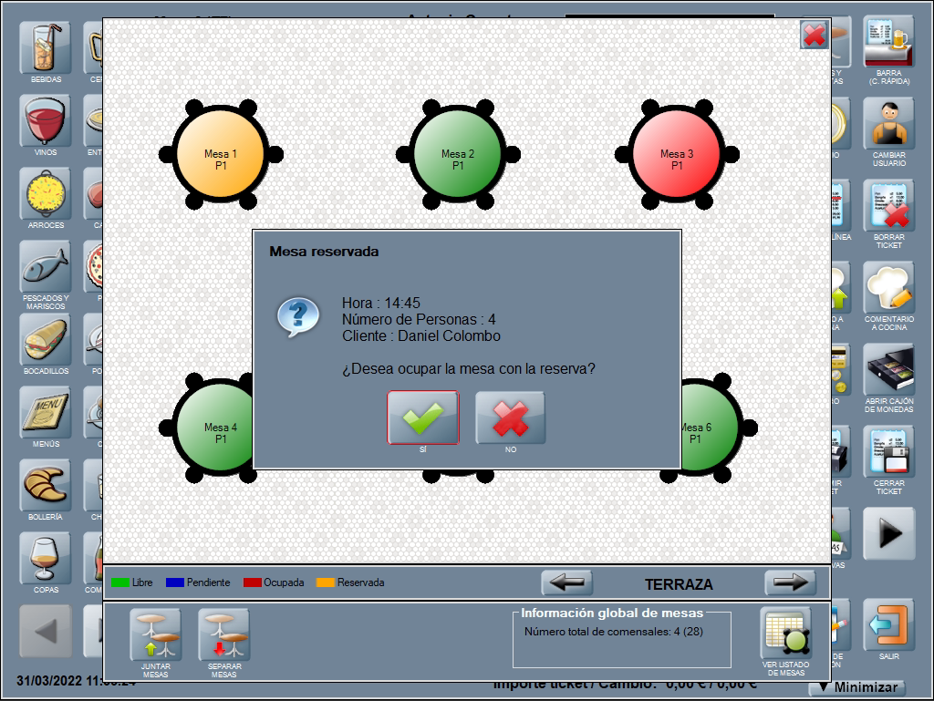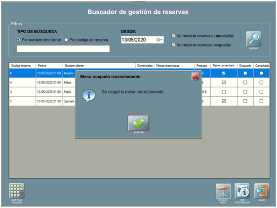 • OCUPAR MESA: ocupa la mesa reservada con la información de la reserva