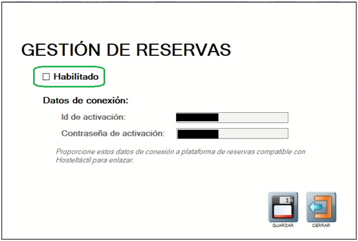 Se abre una pantalla que devuelve los datos de enlace del local (datos de conexión). Simplemente desmarca Habilitado, y el enlace con la plataforma de reservas CoverManager o Restoo dejará de estar disponible. No olvides GUARDAR.