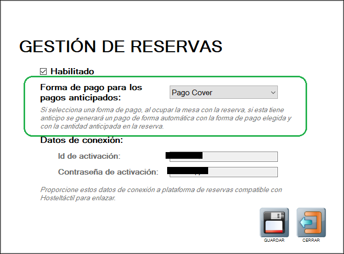 Los datos de conexión (id de activación y contraseña) son necesarios para completar la configuración del sistema, y deberás proporcionarlos a CoverManager o Restoo.