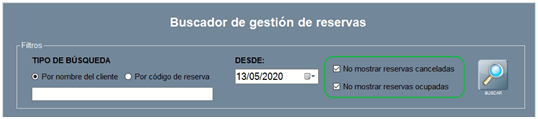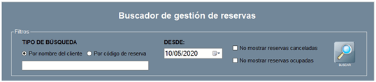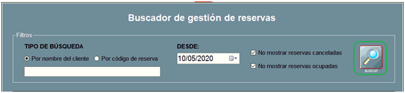 Además, la ventana Buscador de Gestión de Reservas contiene una serie de filtros, que explicamos a continuación, para facilitar la búsqueda rápida: