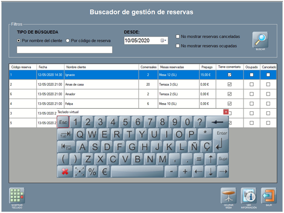 Dispones de un botón MOSTRAR TECLADO, para hacer visible el teclado en pantalla, que puedes usar para búsquedas por nombre de cliente o código de reserva.