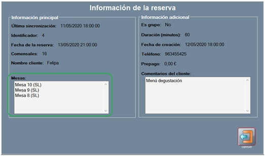 Si el cliente reservó más de una mesa se indican todas las mesas reservadas.