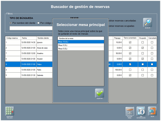 Además, al ocupar una reserva de este tipo, se abre una ventana para seleccionar la mesa principal sobre la que se juntarán el resto de mesas.