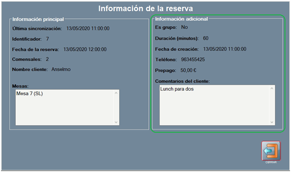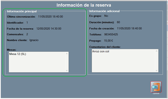 La ventana Información de la reserva muestra 2 bloques: a la izquierda Información principal; y a la derecha, Información adicional.