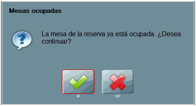 Puedes ocupar la mesa con la reserva tras aceptar el aviso ¿Desea ocupar la mesa con la reserva? al realizar doble click sobre la mesa que se muestra reservada en color amarillo en el plano de mesas.