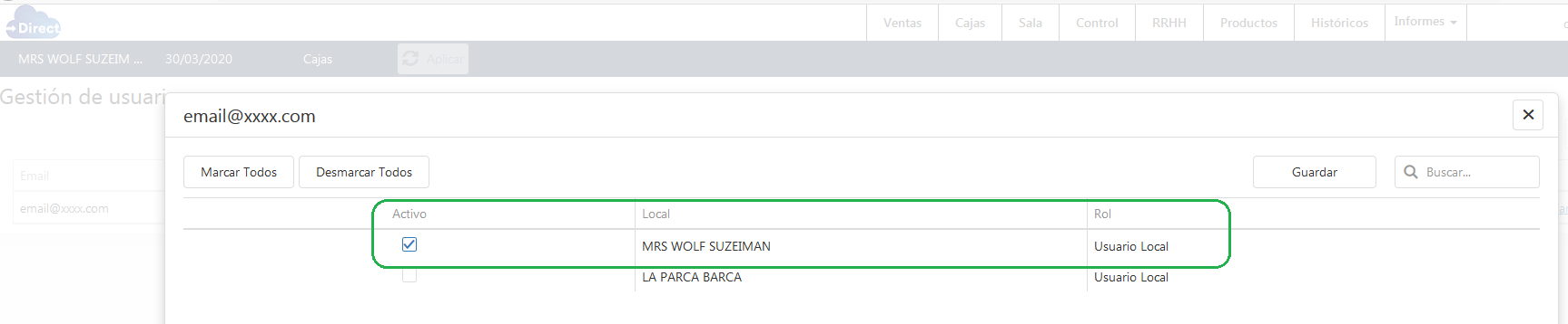 Luego, indica de entre los locales disponibles en cual debe estar activo, seleccionándolo para ese local o Marcar Todos. Para eliminar el usuario, desmárcalo o usa Desmarcar Todos.