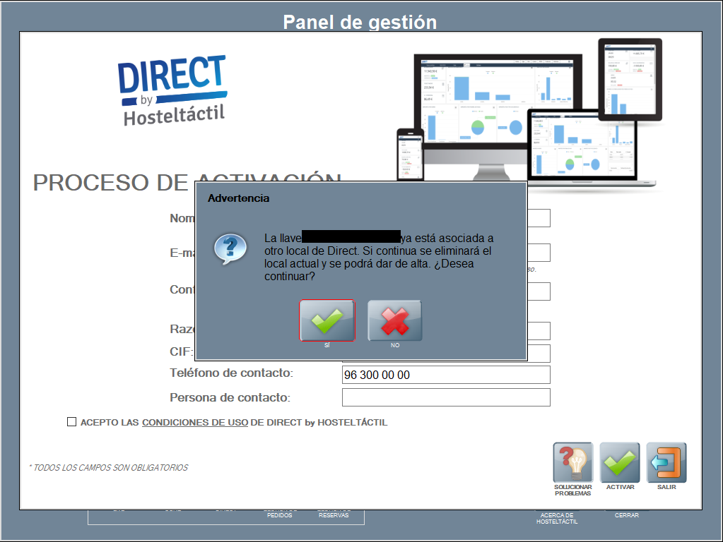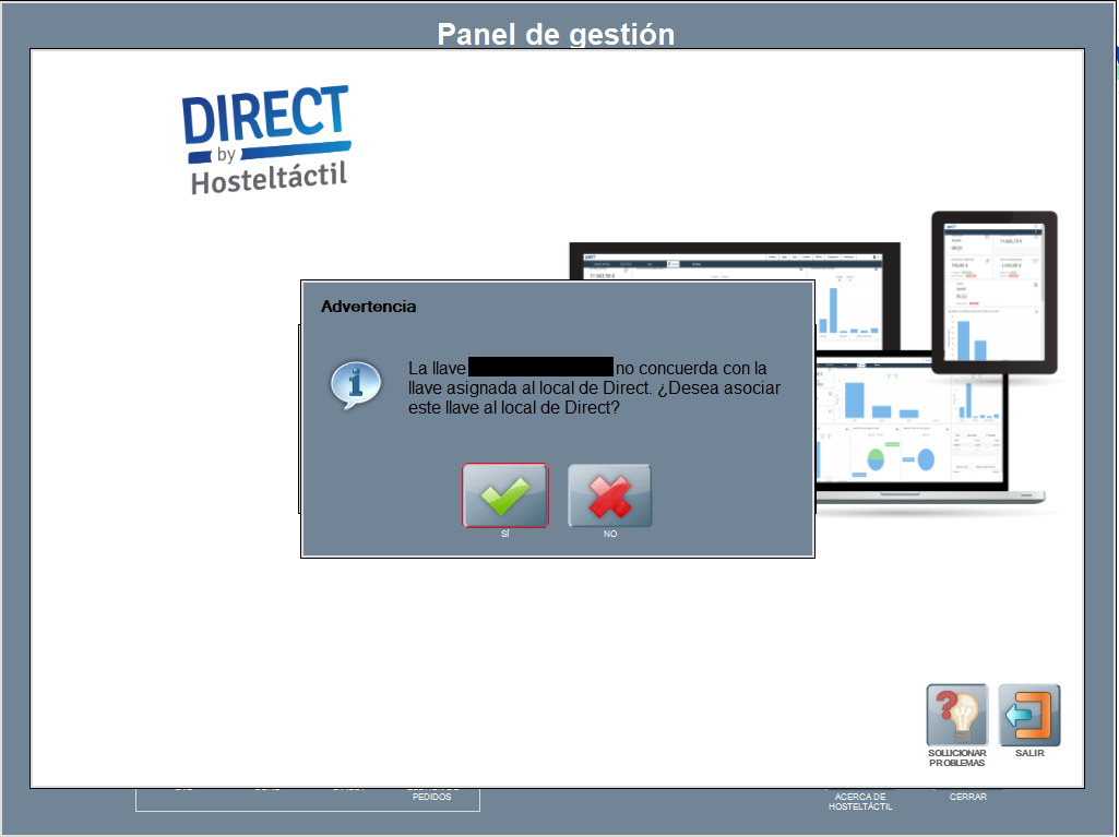El sistema muestra una Advertencia si la llave de licencia no concuerda con la llave de licencia asignada al local de Direct. Por favor, si deseas asociar la llave de licencia actual pulsa SI.