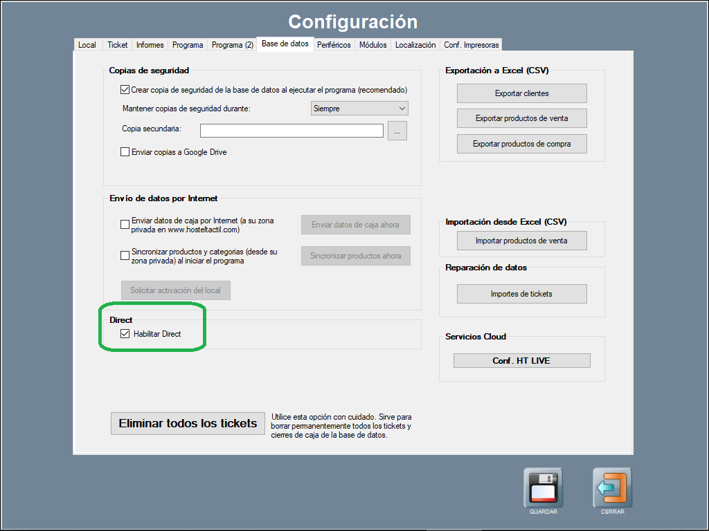 Ten en cuenta que si la activación de Direct se realizó con una llave de licencia que no coincide con la que tiene el TPV ahora, Direct no funciona.