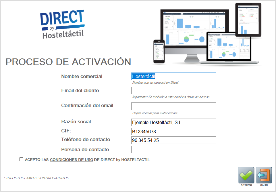 Rellena los datos según proceda, acepta las condiciones y pulsa sobre ACTIVAR: el programa conectará con el servidor de altas de Direct, tras lo que se realizará el registro y recibirás un correo con la contraseña para el acceso a Direct.