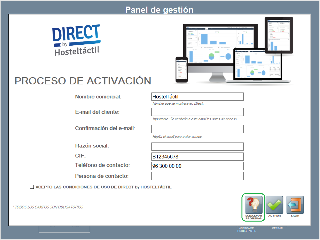 Desde Panel de Gestión / SAAS / Direct, abre el formulario del proceso de activación y pulsa SOLUCIONAR PROBLEMAS.