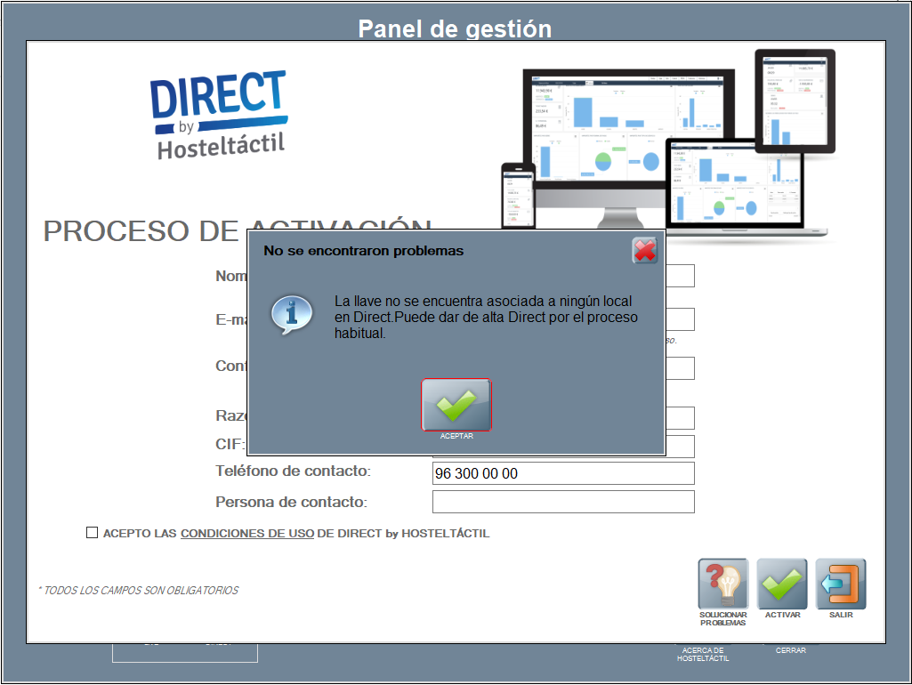 No se encontraron problemas. La llave de licencia no ha sido asociada a ningún local, que es lo esperado, puedes proceder al proceso de activación en Direct siguiendo los pasos indicados en el apartado Activar Direct de esta misma página.