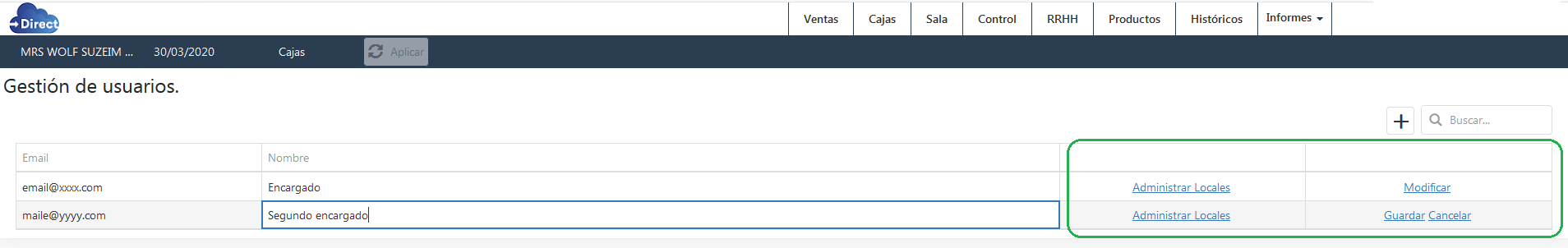 También puedes MODIFICAR para cambiar el nombre asociado a la cuenta de correo y ADMINISTRAR LOCALES para marcar o desmarcar el local al que pertenece y tendrá acceso.