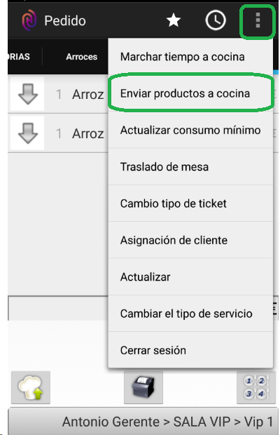 Para enviar manualmente los productos a cocina, ve a la pestaña de Ticket y pulsa sobre el botón de acceso a opciones, entre las disponibles esta la de Enviar productos a cocina, que genera el envío de los productos, platos y bebidas, por las impresoras de cocina configuradas a tal fin.