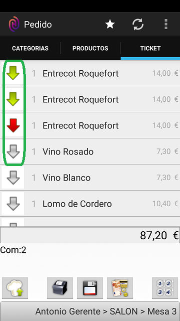 Esta flecha aparece hacia arriba en la pestaña de Pedido, y hacia abajo en la pestaña de Ticket. La diferencia es que, si la flecha está hacia arriba, los productos aún no han sido validados.