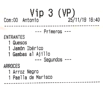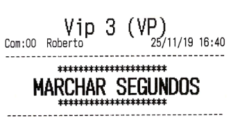 Por ejemplo, si eliges marchar los primeros, saldrá una nota por la impresora de cocina, similar a la siguiente (en primer lugar la comanda, y luego el aviso de marchar):