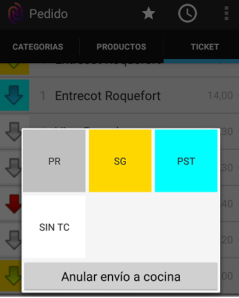 Si quieres que un producto no se envíe a cocina, pulsa sobre la flecha a la izquierda de su línea, y verás que cambia de color, de gris a rojo.
