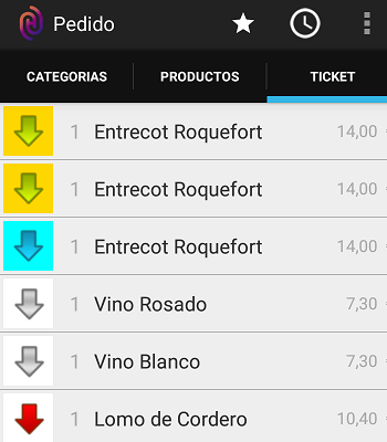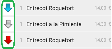 El estado de los envíos a cocina se muestra, para cada producto, con el icono de una flecha a su izquierda.