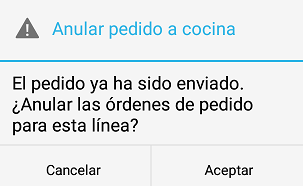 Si el producto ya estaba enviado (con la flecha en verde), saldrá una ventana de confirmación. Acepta en la misma, para enviar a cocina la anulación de pedido.