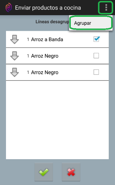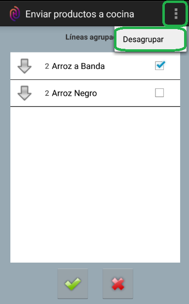 También tienes la opción de Desagrupar las unidades agrupadas para el mismo producto. Para ello, desde la pantalla de Enviar productos a cocina dirígete al botón de opciones y pulsa DESAGRUPAR.