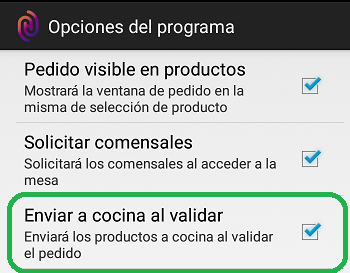 Cuando validas un pedido que contiene productos configurados para pasar por cocina, Telecomanda® por defecto no envía el producto a la impresora o monitor de cocina, salvo que hayas configurado tu terminal móvil para enviar los productos a cocina al validar.