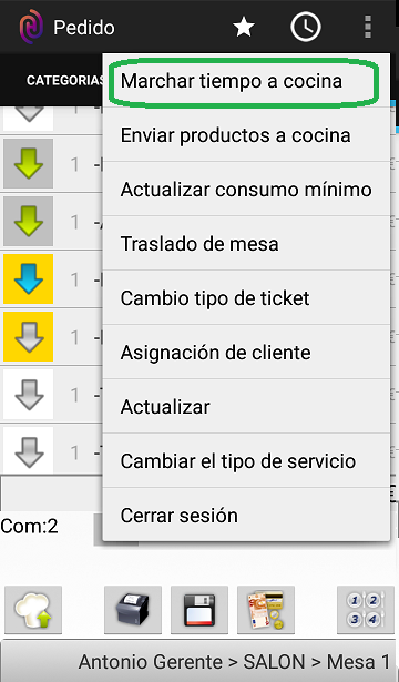Esta acción envía tan solo un aviso a cocina, diciendo que hay que sacar los platos de un tiempo dado (por ejemplo, marchar primeros). No se envía el nombre de los productos con esta orden, tan solo el aviso de marchar, y la mesa relacionada.