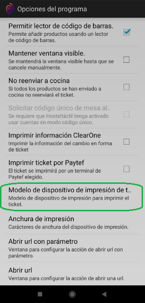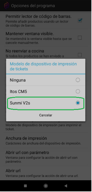 Para configurar la impresión de tickets por la impresora del dispositivo Sunmi v2s, por favor, dirígete a Opciones del programa.