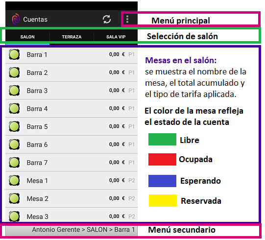 Para volver a la vista de Cuentas: usa el botón de retroceso, o pulsa sobre el nombre del salón (en el menú secundario).
