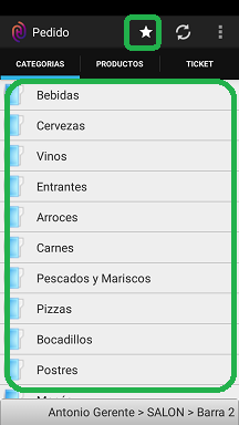 Es en esta pestaña donde elegirás los productos que quieras anotar al pedido. Fíjate que, cuando selecciones una categoría, el nombre de esta pestaña dejará de llamarse Productos, para referirse a la categoría en la que estás navegando (en este caso, Bebidas).