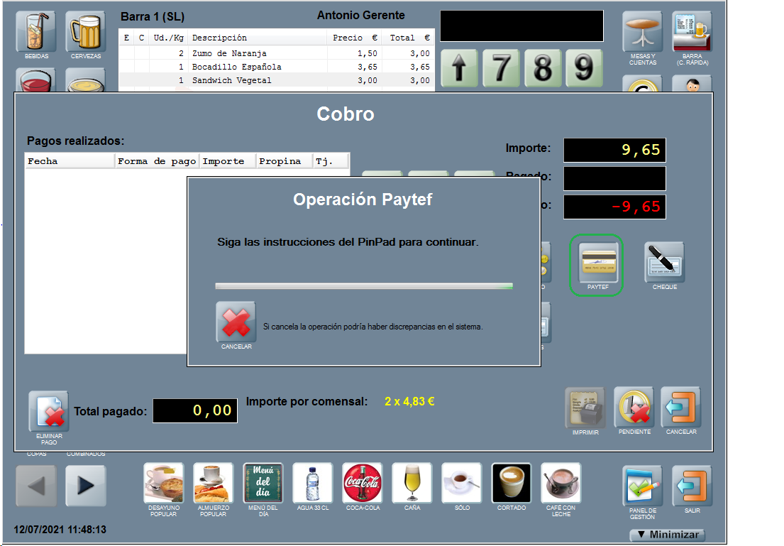 Si solo hay un pinpad conectado, el sistema procesará la operación a través de ese pinpad directamente. En este punto debes seguir las instrucciones mostradas en el visor del pinpad y Hosteltáctil® procesará el resultado de la operación.