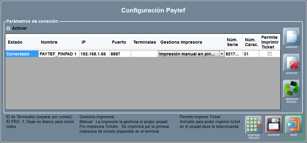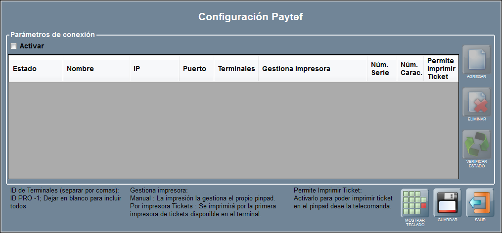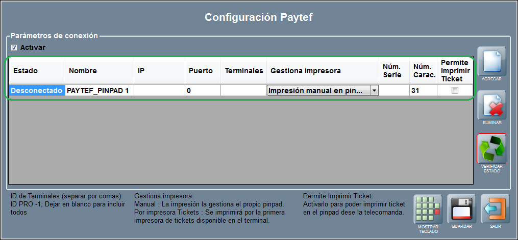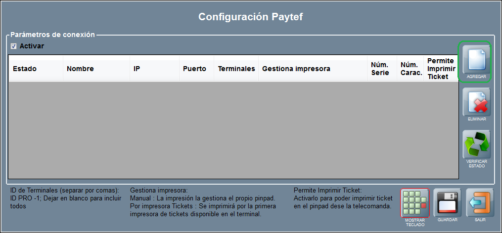 A continuación podrás agregar cada uno de los pinpads que necesites. Para ello, pulsa AGREGAR entre los botones situados a la derecha de la ventana de Configuración PAYTEF.