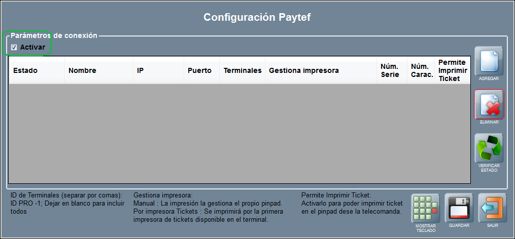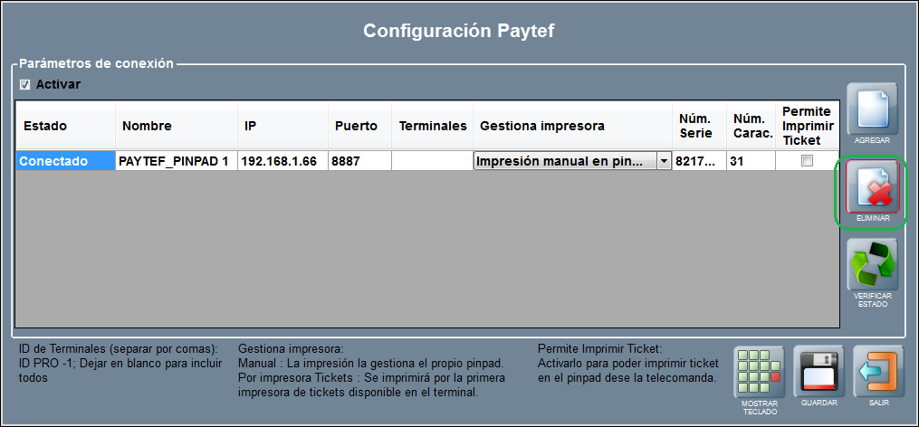 Si necesitas eliminar un pinpad de la lista de pinpads configurados sitúate sobre cualquier campo de la fila para seleccionarlo y pulsa ELIMINAR.
