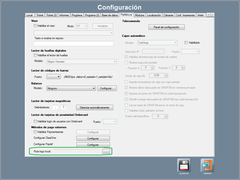 Para cargar el logo en la cabecera de los tickets que imprime la impresora del pinpad, por favor, dirígete a Panel de Gestión / Configuración / Periféricos / Métodos de pago externos / Ruta logo local.