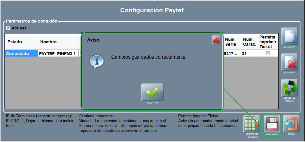 Se abre la ventana de Configuración PAYTEF.