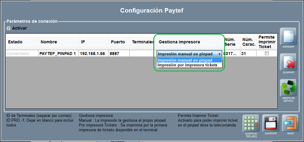 • Gestiona Impresora: indica si el pinpad gestiona la impresión del cobro (requiere pulsar en el pinpad para imprimir) o si la impresión del resguardo sale por la impresora de tickets.