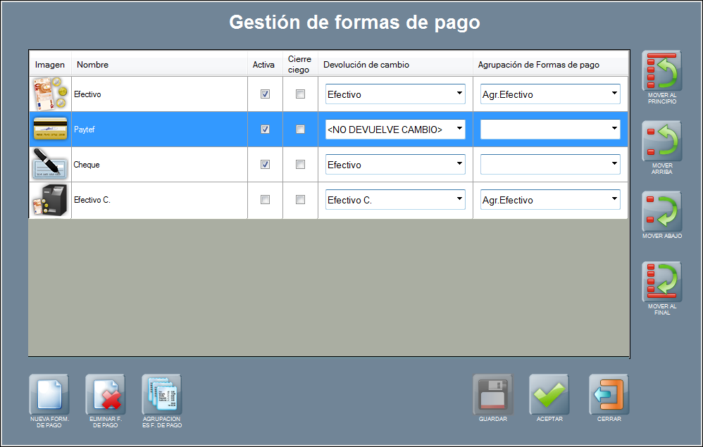 La gestión de cobro por la pasarela de pago por tarjeta PAYTEF requiere de la activación de la forma de pago PAYTEF. Se recomienda no tocar nada de su configuración y mantenerla activa, ya que esta debe estar disponible para su uso desde la ventana de Cobro.