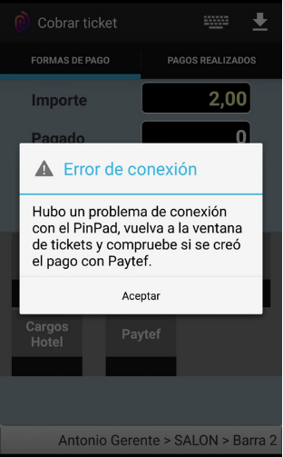En el caso de que no haya ningún terminal de pago disponible, Hosteltáctil® informa del problema de conexión.
