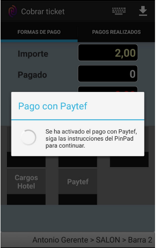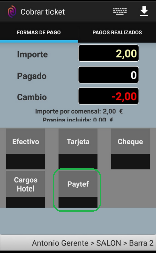 La ventana de pagos es similar a la de Hosteltáctil® Pro, por lo que si ya la conoces, te resultará sencilla e intuitiva. Indica que deseas cobrar ticket con la forma de pago Paytef.